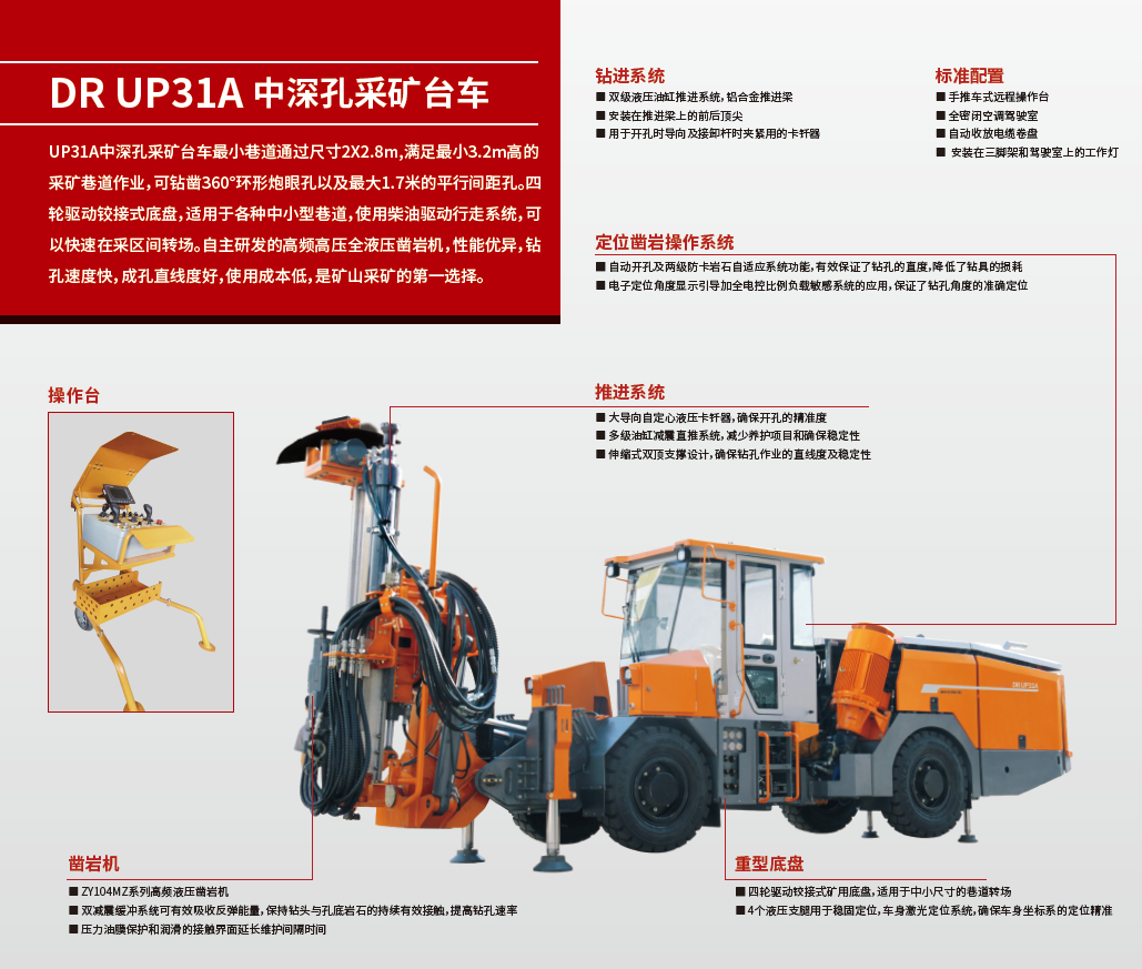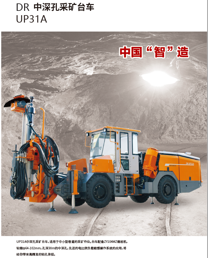 UP31A中深孔采礦臺車,適用于中小型巷道的采礦作業(yè)。臺車配備ZY104MZ鑿巖機,鉆鑿φ64-102mm,孔深42m的中深孔,先進的電比例負(fù)載敏感操作系統(tǒng)的應(yīng)用,將給你帶來高精準(zhǔn)的鉆孔體驗。