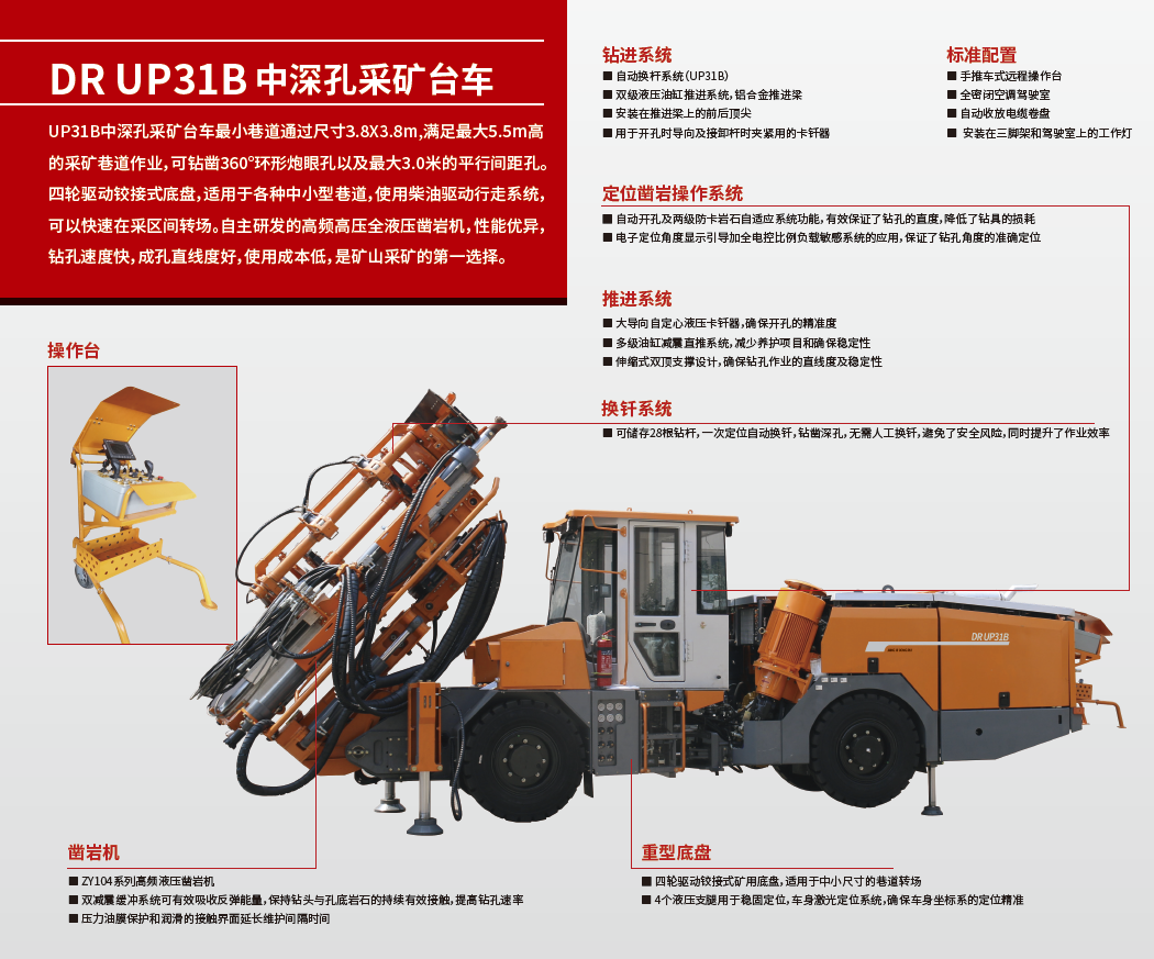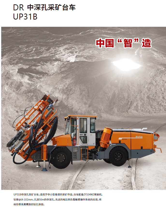 UP31B中深孔采礦臺車,適用于中小型巷道的采礦作業(yè)。臺車配備ZY104MZ鑿巖機,鉆鑿φ64-102mm,孔深50m的中深孔,先進的電比例負載敏感操作系統(tǒng)的應用,將給你帶來高精準的鉆孔體驗。